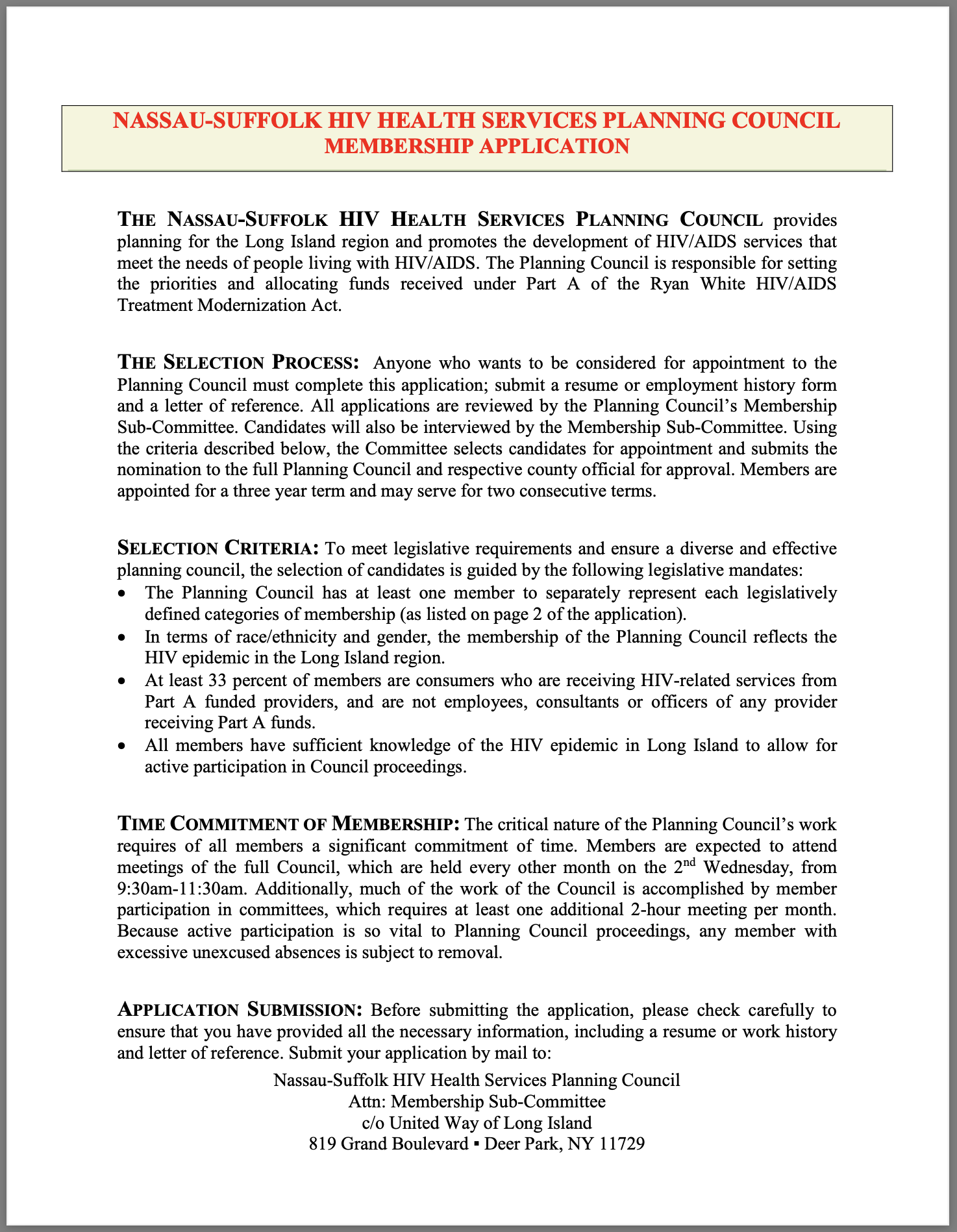 If you are interested in lending your voice and becoming a member of the Planning Council, please download and fill out the membership application below. The membership process includes completing an application with a resume or bio, with one letter of character reference.
